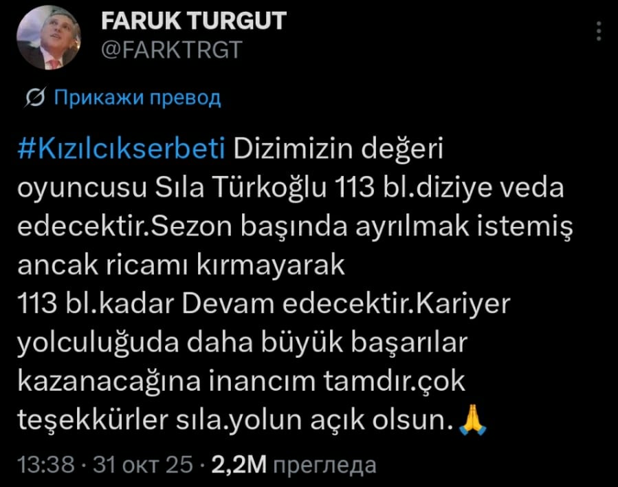 Koliko god ovo bilo teško za fanove, odluka je već doneta i ne može se promeniti — glumica je lično potvrdila da odlazi i objavila to na svom profilu na društvenim mrežama. Zanimljivo je da je to uradila upravo ispod objave producenta Faruka Turguta.